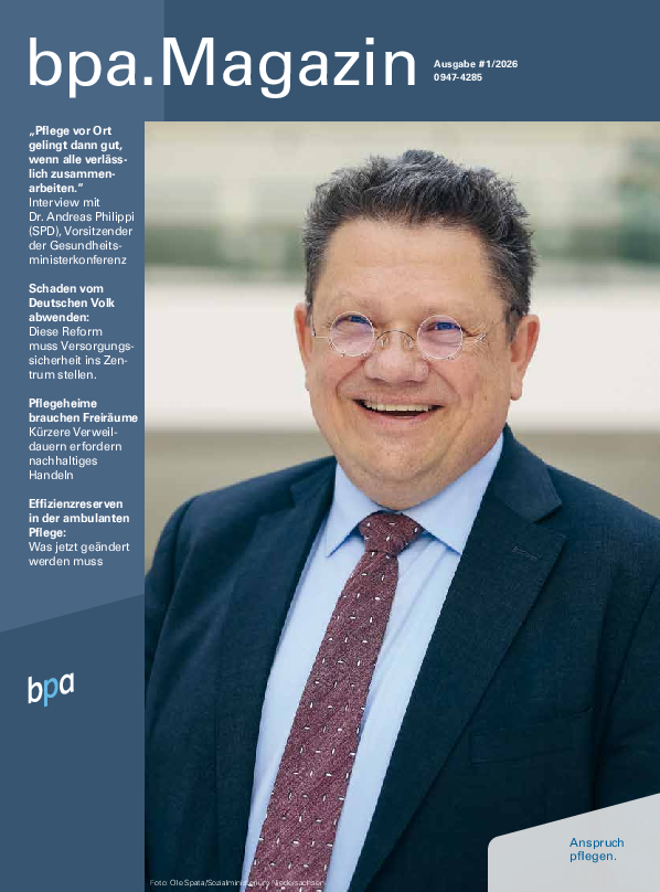 Das bpa.Magazin informiert über das Neueste aus der Verbandsarbeit. Darüber hinaus bringt es Fachbeiträge zu Qualitäts-, Rechts- und vielen weiteren Fragen rund um die Pflege. Anerkannte Experten veröffentlichen regelmäßig Artikel im bpa.Magazin.