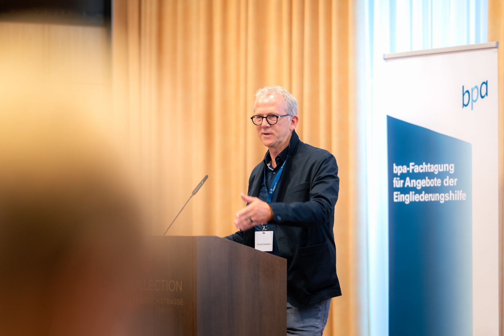 bpa-Präsidiumsmitglied Christof Schaefers eröffnete die Veranstaltung am Donnerstag und erinnerte an das gemeinsame Ziel, welches alle Anwesenden eint: die Stärkung der Selbstbestimmung der Menschen mit Behinderung durch eine personenzentrierte und wirtschaftlich tragfähig ausgestaltete Leistungserbringung. Wie das trotz herausfordernder Rahmenbedingungen möglich ist, zeigte u.a. der Austausch an unseren beiden Fachtagen.