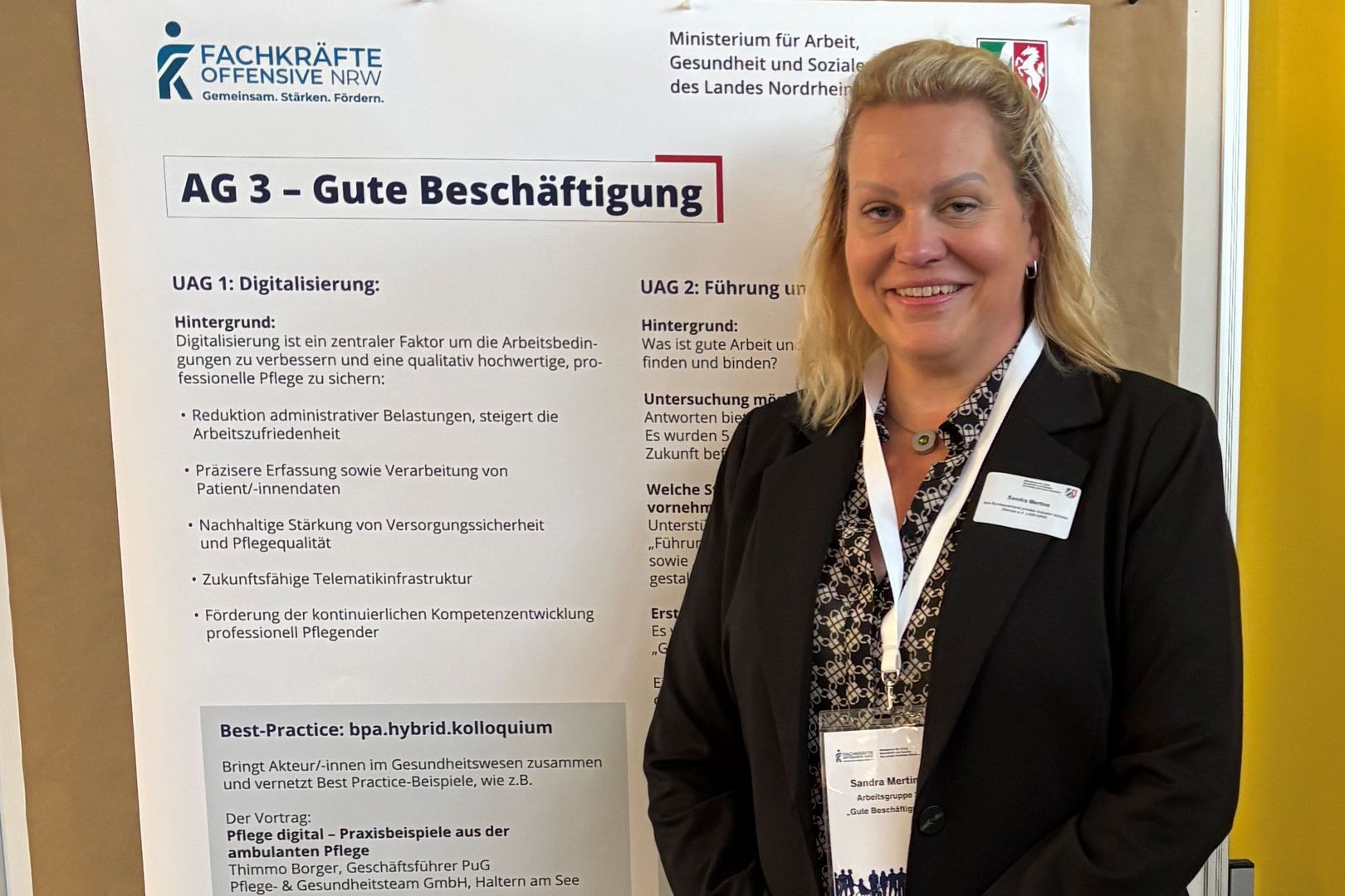 Sandra Mertins, bpa-Landesbeauftragte und Sprecherin der Unterarbeitsgruppe Digitalisierung der AG „Gute Beschäftigung“, machte deutlich, dass technologische Entwicklungen eine zentrale Rolle für die Arbeitsbedingungen spielen: „Digitalisierung ist kein Selbstzweck – sie ist eine elementare Voraussetzung für gute Beschäftigung. Nur mit modernen digitalen Strukturen schaffen wir Entlastung im Arbeits-Alltag und mehr Zeit für die eigentliche Pflege.“
