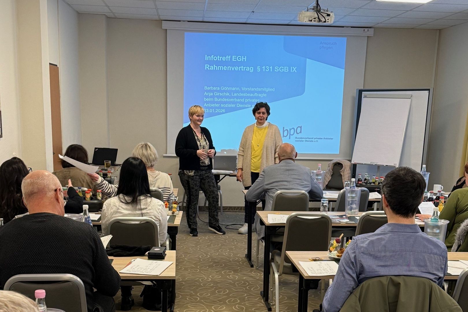 Bei der Informationsveranstaltung zum neuen Rahmenvertrag in der Eingliederungshilfe am 23. Januar 2026 erläuterten Barbara Göhmann, bpa-Vorstandsmitglied in Sachsen-Anhalt, und Anja Girschik, bpa-Landesbeauftrage, die Neuerungen im Rahmenvertrag anhand von Beispielen. Inhalte wie gezielte Förderungen für Menschen mit Behinderungen zu mehr Teilhabe an der Gesellschaft und am Arbeitsmarkt standen im Focus. Leistungsumfang und Inhalte werden künftig über einen Leistungskatalog festgelegt, wie ihn das Bundesteilhabegesetz vorsieht. Demnach soll beispielsweise eine leistungsberechtigte Person, die in einer eigenen Wohnung lebt, verschiedene Leistungen unterschiedlicher Anbieter auswählen können – etwa Assistenz im Alltag oder Unterstützung bei Freizeitaktivitäten.