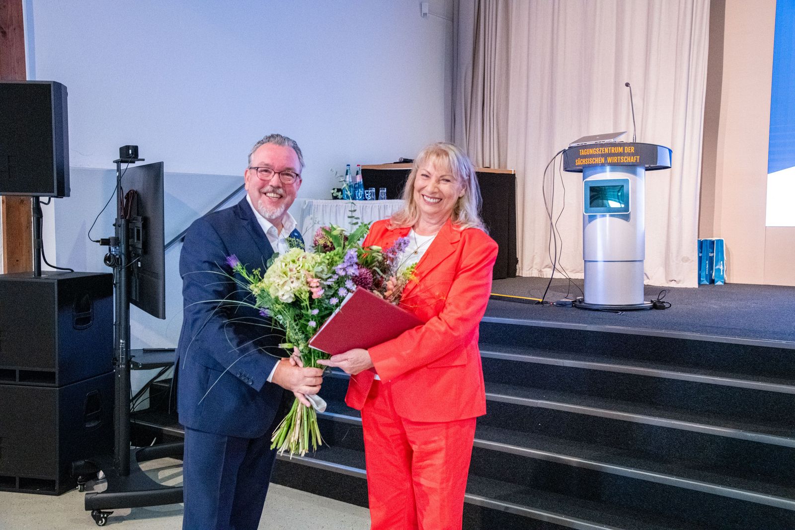 Igor Ratzenberger, bpa-Landesvorsitzender, dankt Petra Köpping, Staatsministerin für Soziales, Gesundheit und Gesellschaftlichen Zusammenhalt
