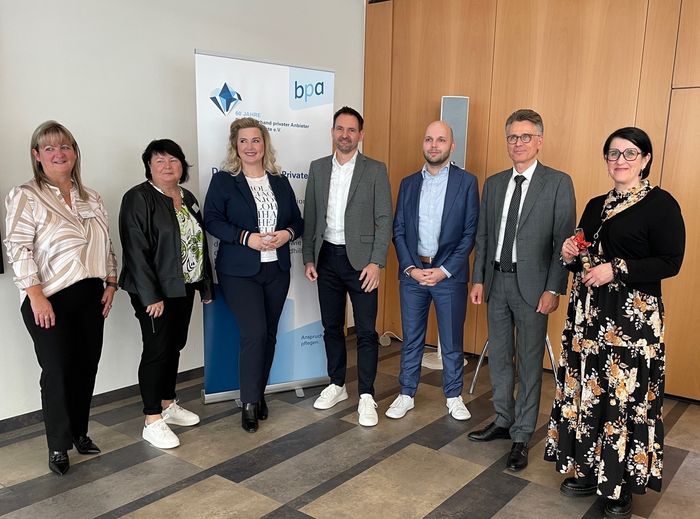 v.l.n.r.: Astrid Regel (stellv. Vorsitzende bpa Thüringen), Margit Benkenstein (Landesvorsitzende bpa Thüringen/bpa-Vizepräsidentin), Katja Hopf (Geschäftsführerin WPZ Mühlhausen), Sven Wolfgram (Geschäftsführer, Geschäftsbereichsleiter ambulante Versorgung), Pascal Tschörtner (Geschäftsführer, Geschäftsbereichsleiter stationäre Versorgung), Joachim Görtz (Leiter Landesgeschäftsstelle Bayern) und Verena Daus (Beraterin ambulante und teilstationäre Pflege)